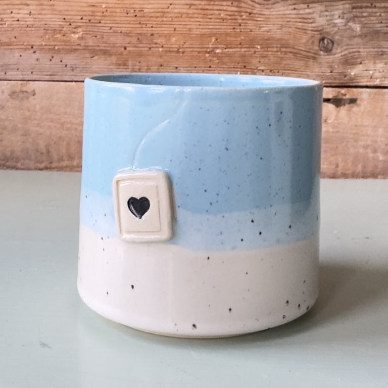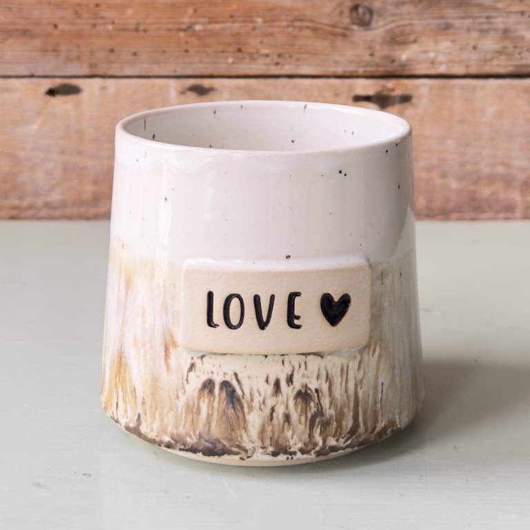 Keramikkop med brune og hvide nuancer, dekoreret med en lille firkantet "tepose" med et sort hjerte.