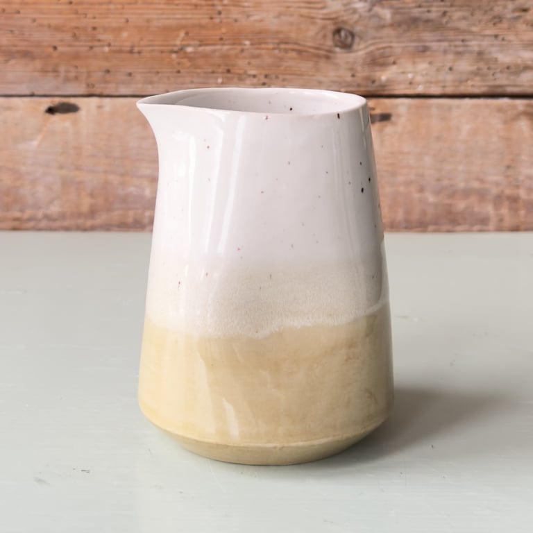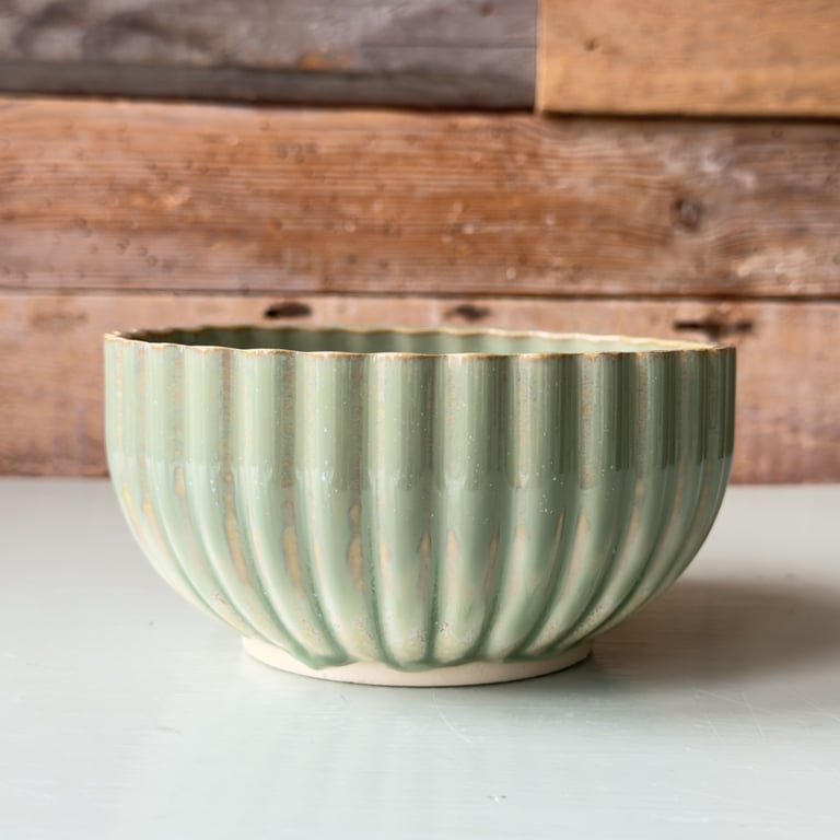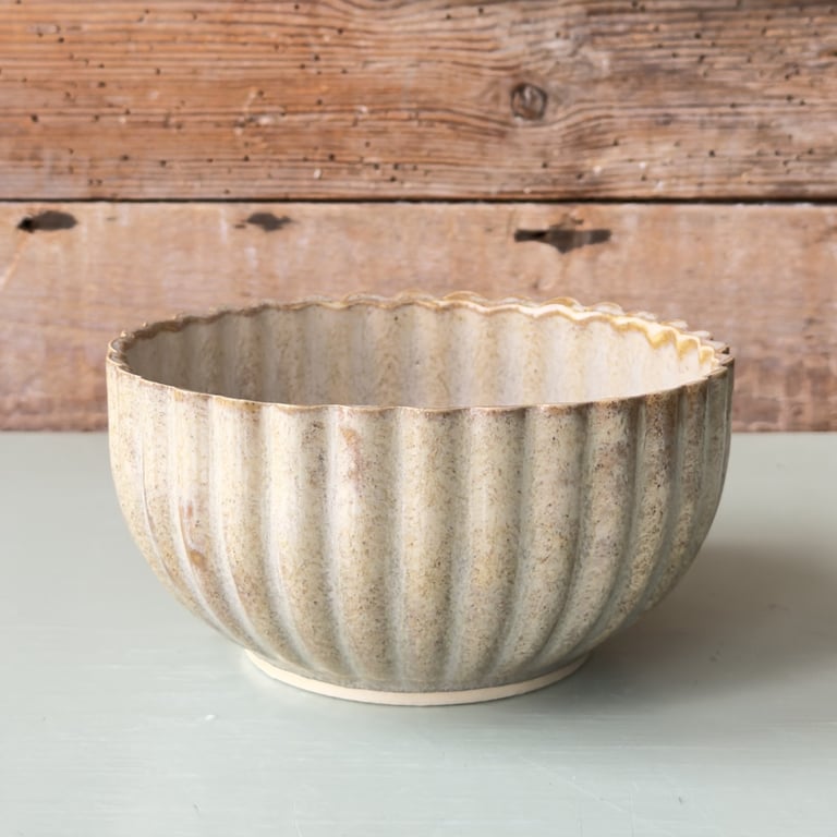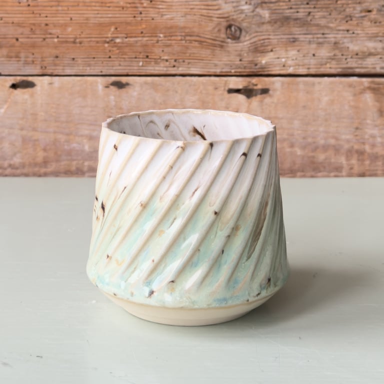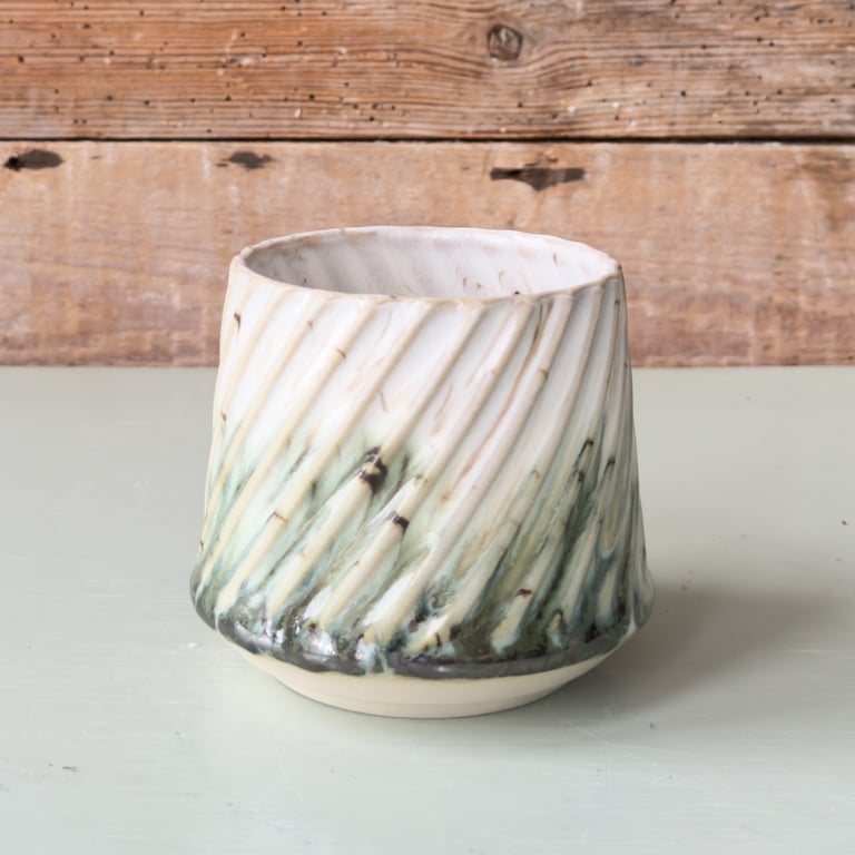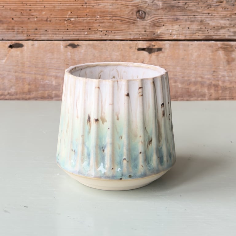 Keramisk krukke med lodrette riller i beige og hvid, placeret på en lys overflade foran en rustik trævæg.