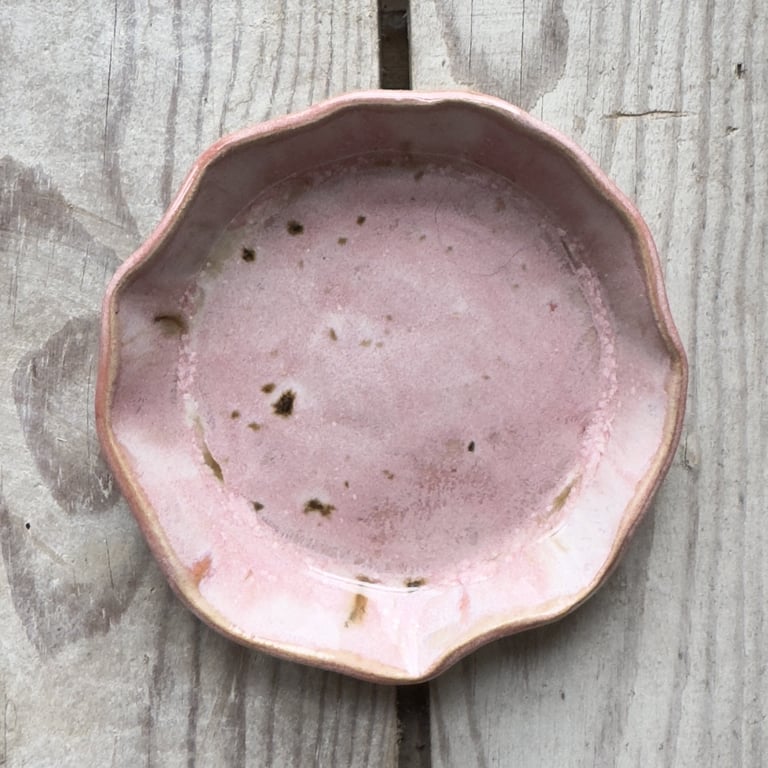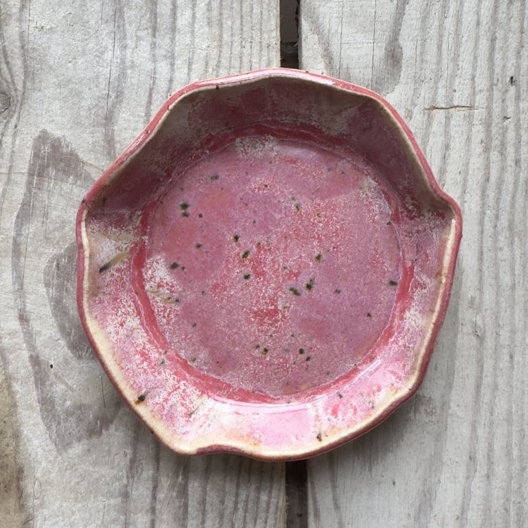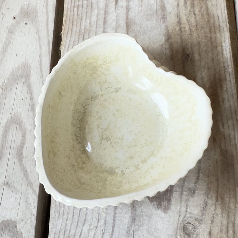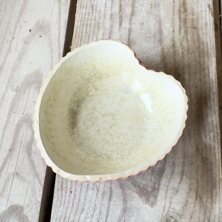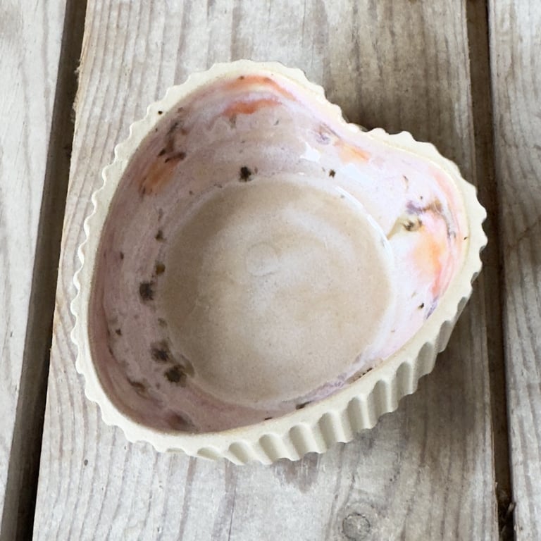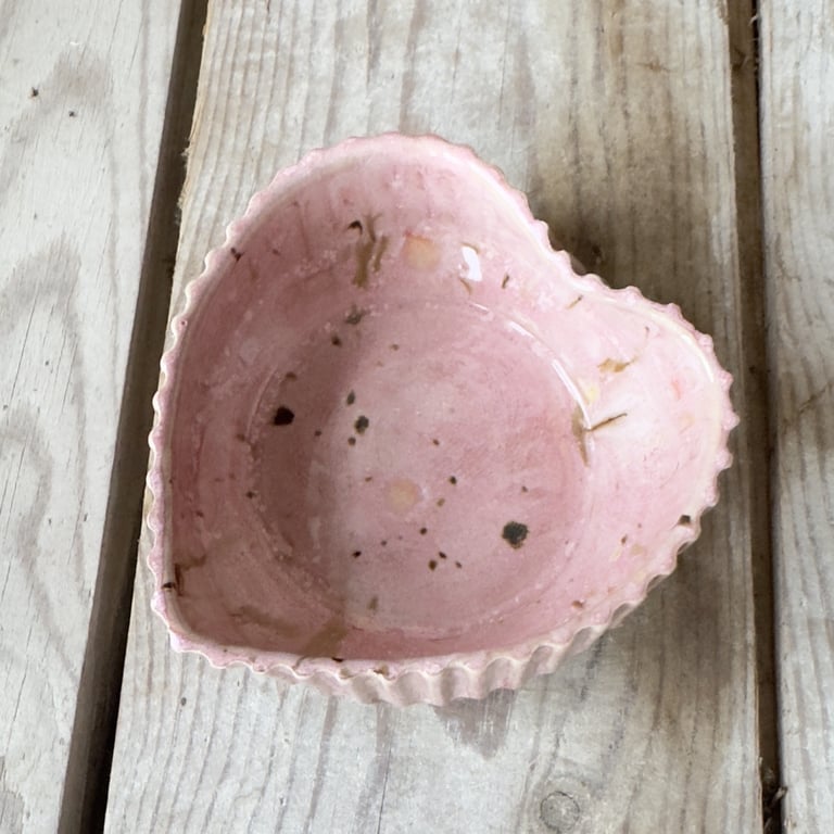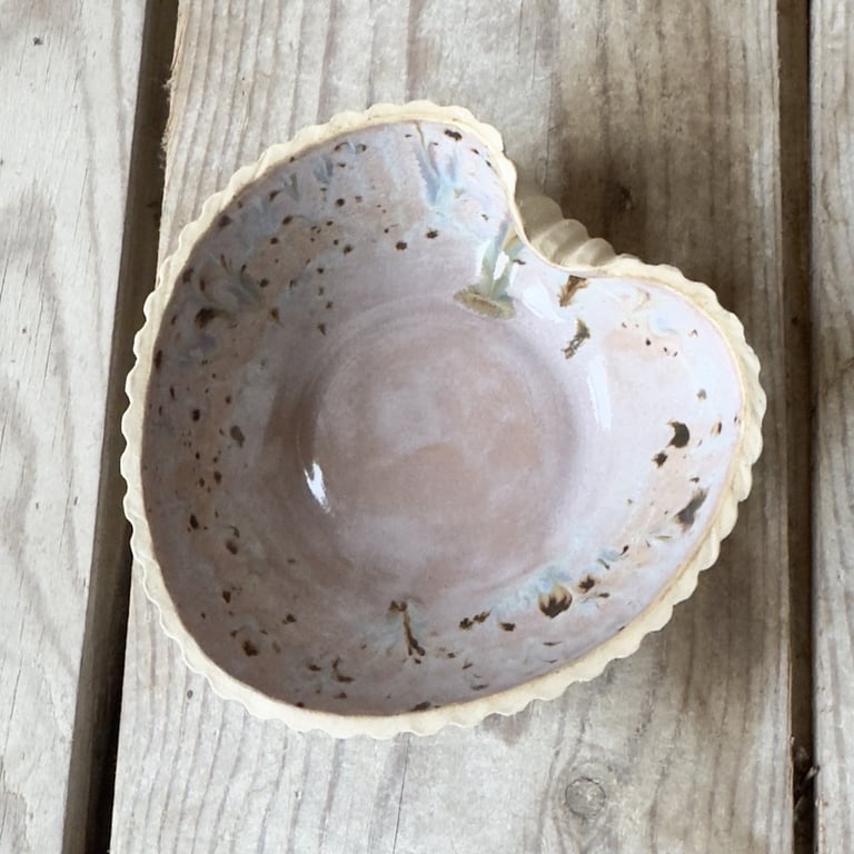 Keramisk, hjerteformet skål med bølget kant og udvendige riller, farvet i lyserøde og brune nuancer.