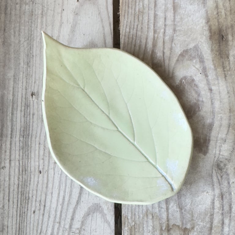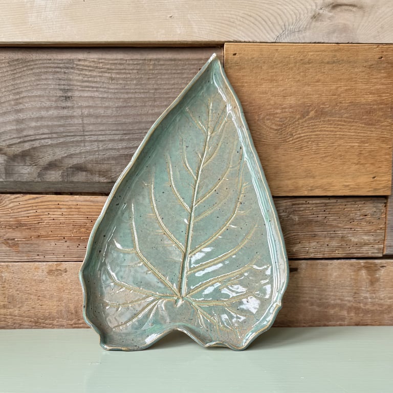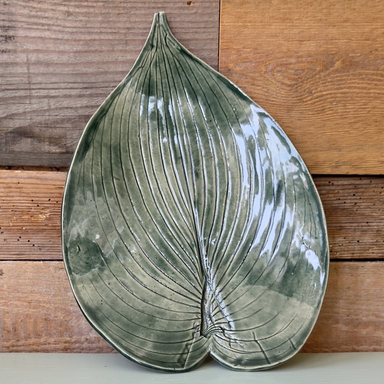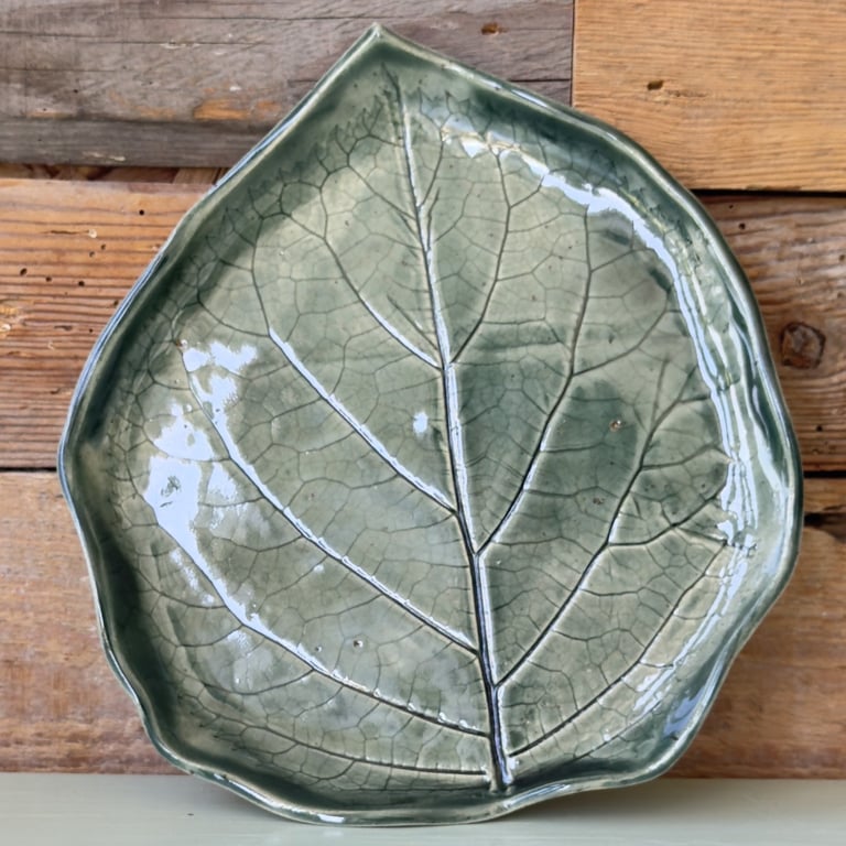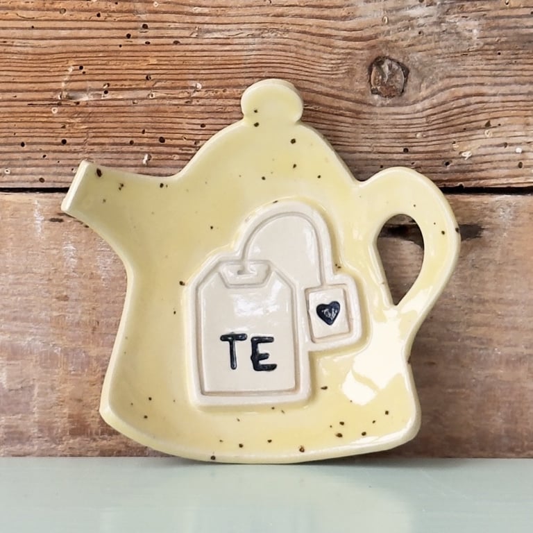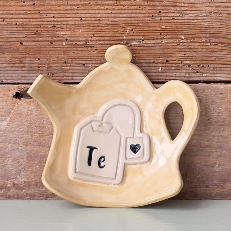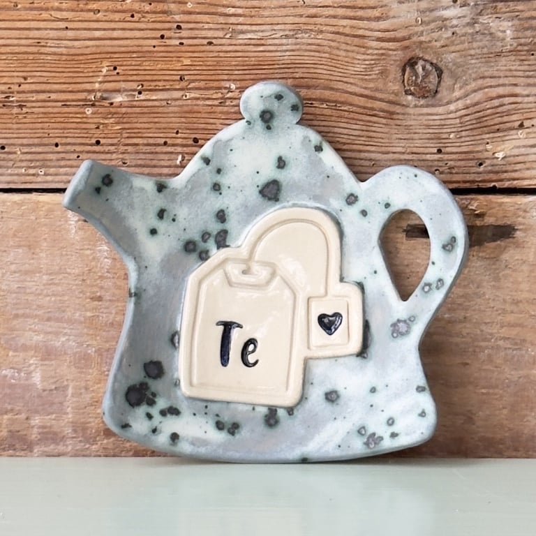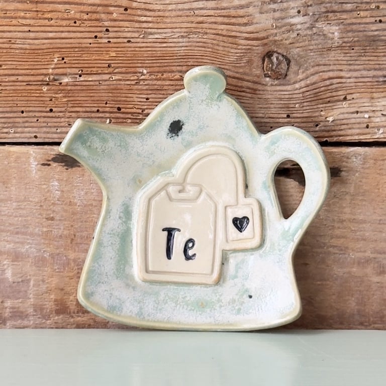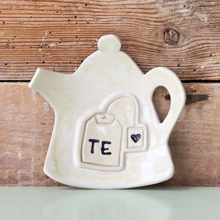 Keramisk teblad-holder formet som en tekande med en tebrevsdekoration og teksten "Te" på forsiden, placeret foran en rustik trægavl.