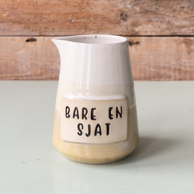 Keramisk kande med blå og beige glasur samt teksten "Bare en sjat" på forsiden, placeret på en lys overflade med en træbaggrund.