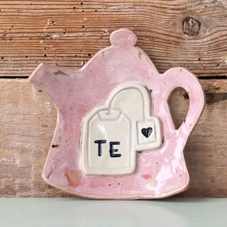 Rosa keramisk tekandeformet tallerken med udstikket tepose og teksten "TE" foran, stående på hvid overflade med træbaggrund.