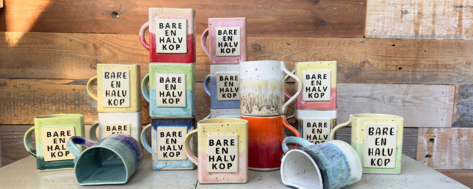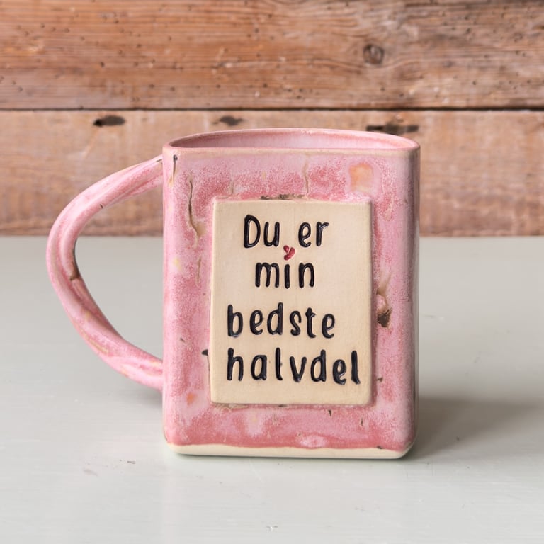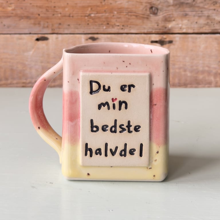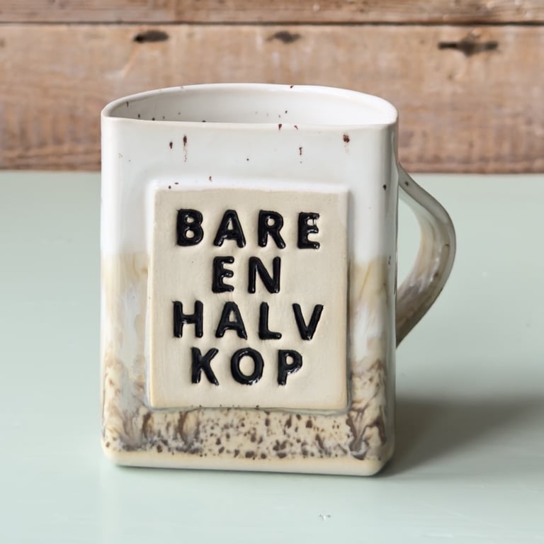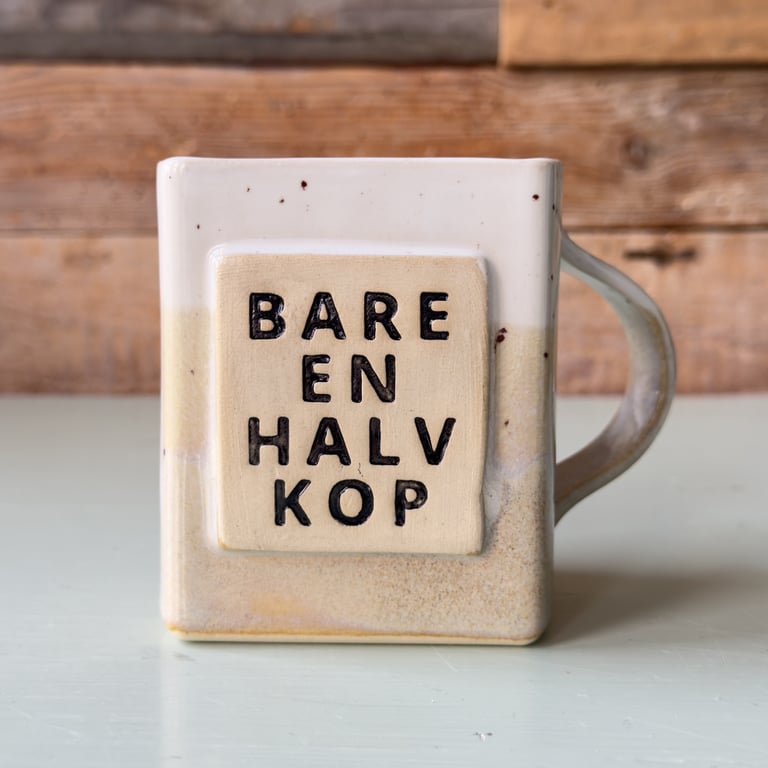 Firkantet krus med beige og brunlige pletter og teksten "BARE EN HALV KOP" på forsiden.
