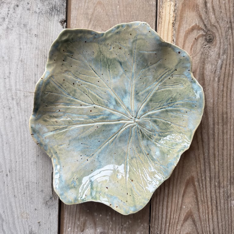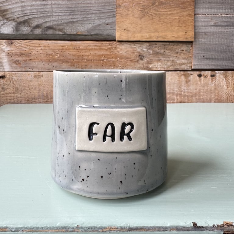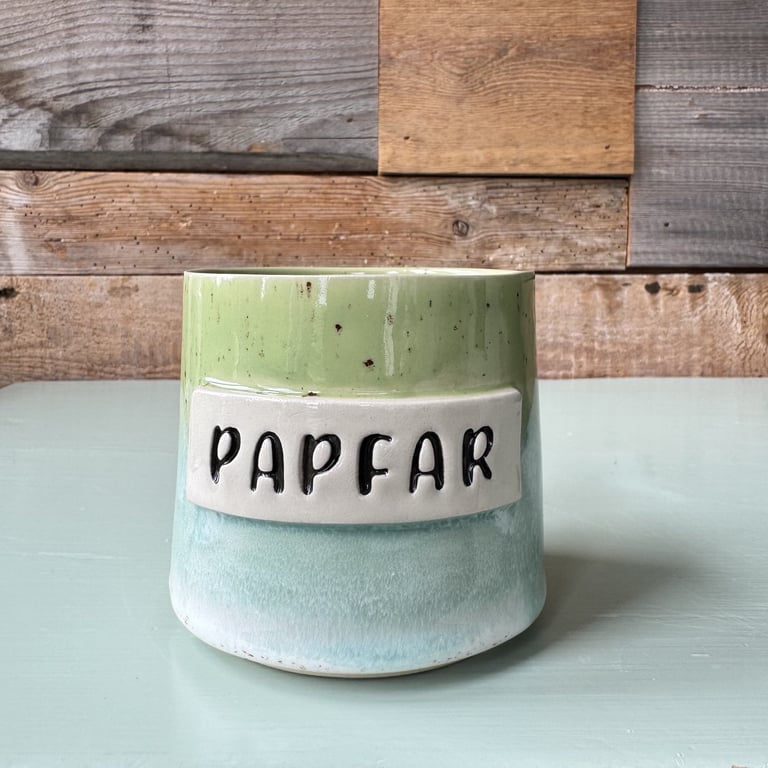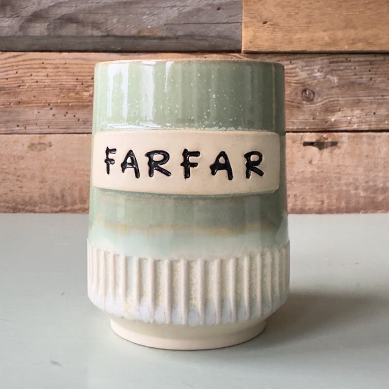 Keramikkrus med grønne, blå og beige nuancer med teksten "FARFAR" i sort.