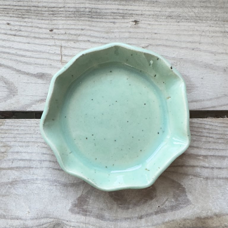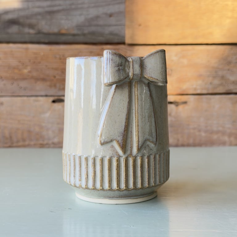 Lilla keramik krus med dekorativ sløjfe på fronten, placeret på lys overflade med træbaggrund.