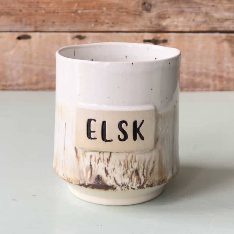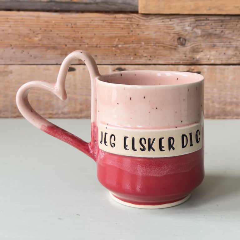 Keramikkrus med teksten "M♥R" på hvid og beige baggrund foran en trævæg.
