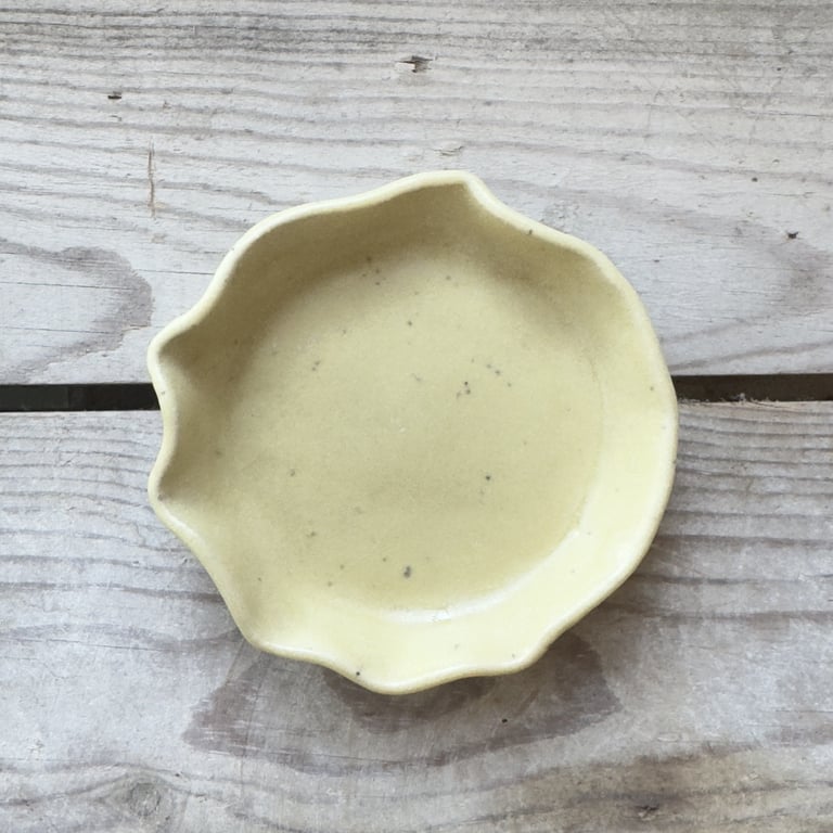 Lille keramikkrus med spiralformet mønster i lyserød og gul gradient på hvid bund, placeret på lys bordplade med træbaggrund.