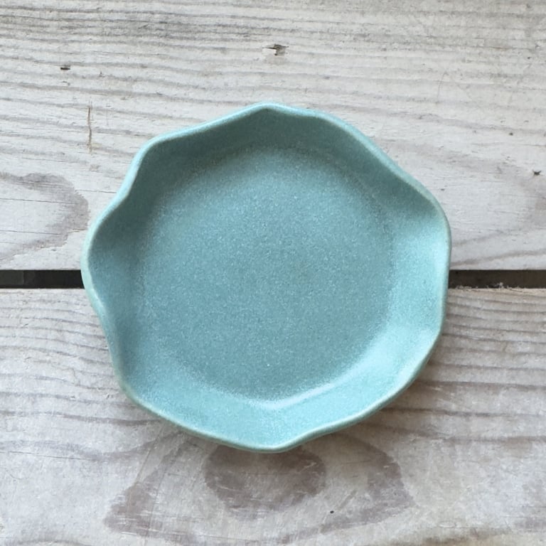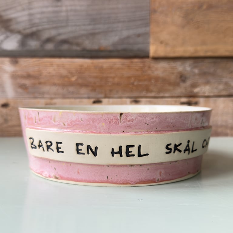 Pink, uregelmæssigt formet keramikfad med teksten "BÅRE EN SNACK" påsat, placeret foran en trævæg.