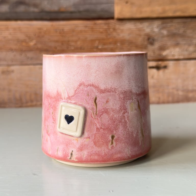 Keramikkop med lyserød og gul glasur samt en hængende tepose med et hjerte i sort.