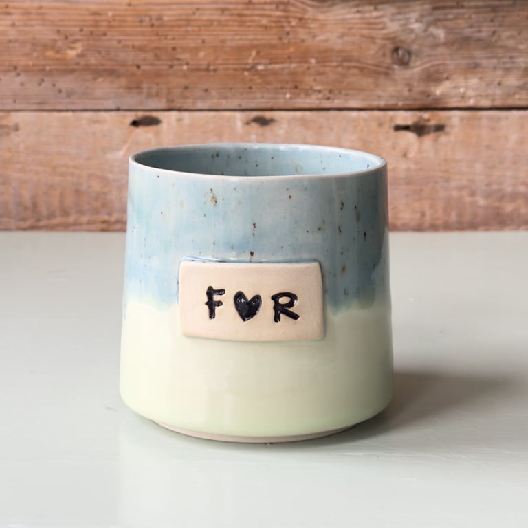 Keramikkop med glaseret finish i lyserøde og blå nuancer, med skilt hvor der står "M♥R".